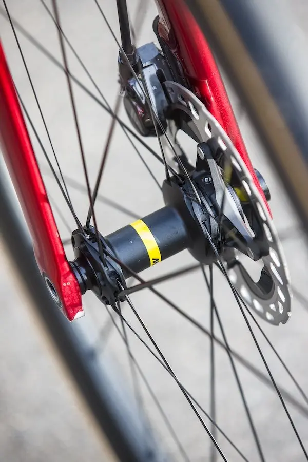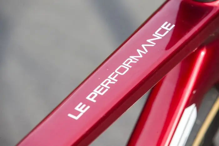 Si le Vitesse montre avec ses lignes à la fois massives et acérées qu’il est un vélo fait avant tout pour rouler vite sur le plat, le Performance adopte des lignes un peu plus consensuelles, mais peu éloignées finalement des Specialized Tarmac et Cannondale SuperSix, deux des références dans le domaine. La forme des tubes est travaillée pour filer contre le vent, mais le cadre conserve un poids performant avec 890 g annoncés en taille M avec la peinture. Du côté de la structure même des tubes, on trouve un châssis rigide, mais sans excès, qui favorise surtout le dynamisme global du vélo. Le choix des roues va aussi dans le sens de la polyvalence avec ici des Mavic Cosmic SLR 45 pour cette version haut de gamme du Performance (la même que les pros de Nantes) et des roues chinoises Lun Road pour la version en Ultegra Di2, de manière à bénéficier d’un bon aérodynamisme, mais sans subir non plus un poids trop élevé dans les ascensions, ni avoir des difficultés à contrôler le vélo avec le vent de côté.