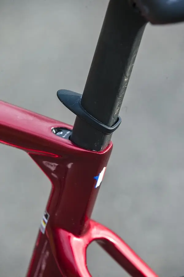 Joliment réalisé, le Performance bénéficie d’une intégration complète des durites de frein à l’intérieur du poste de pilotage monocoque signé Adris, puis dans la douille de direction et dans le reste du cadre. C’est propre et rien ne dépasse. La tige de selle aérodynamique provient aussi d’une production spécifique pour le vélo. Le serrage s’effectue par le devant sur le dessus du tube horizontal, et la vis est dissimulée par un cache en caoutchouc, malheureusement pas très efficace car il a tendance à bouger en roulant. Mais c’est un détail.