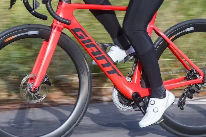 En dehors des composants de position (selle, tige de selle, potence et cintre), le Propel est également équipé de roues et de pneus Giant qui se distinguent par leur stabilité d’une part, mais aussi par leur confort et par leur adhérence. Affichés en 700×25, les pneus tubeless Gavia mesurent en réalité 28 mm de section sur les roues SLR 1 50 Carbon Disc. Ils ne sont certes pas les plus légers ni les plus performants du marché, mais associés aux roues Giant à 1600 g, ils forment un ensemble cohérent pour ce niveau de prix, avec une forme de la jante et du pneu qui semble idéale pour contrôler les mouvements parasites du vélo. Quand on parle d’affronter le vent, que ce soit de face, de côté ou de dos, la marque domine manifestement bien son sujet.