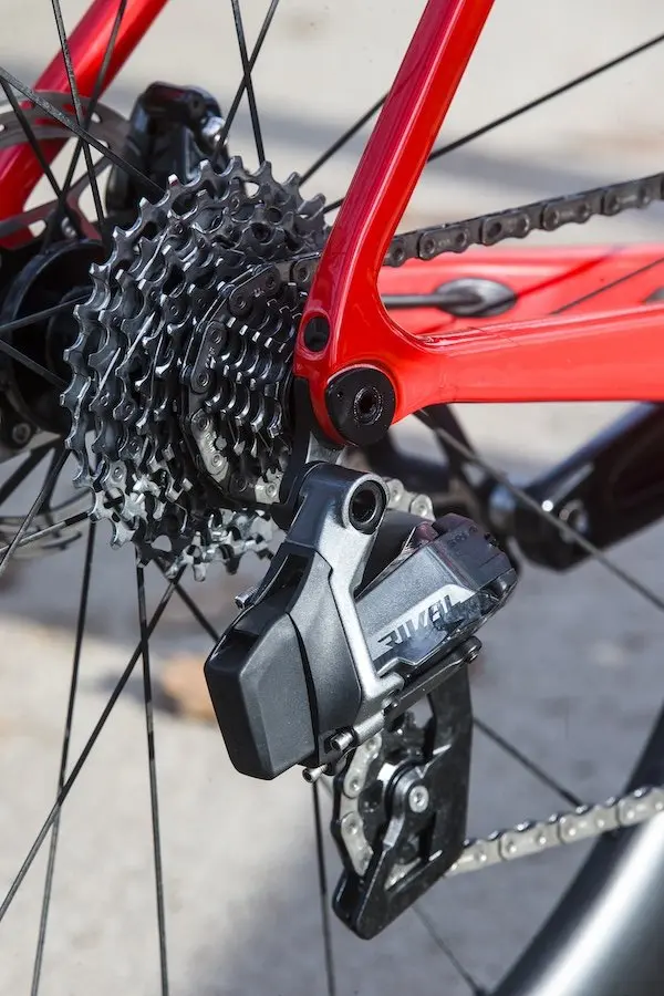Mais ce serait une erreur de résumer le Giant Propel Advanced Pro 1 seulement à cet embonpoint. D’abord parce qu’il bénéficie d’un groupe qui propose toutes les fonctionnalités qu’on attend d’une transmission moderne, avec 12 vitesses, des changements de vitesse électroniques et sans fil, ainsi qu’un freinage à disque hydraulique. Et on peut même affirmer qu’en termes de rapidité, de souplesse et de précision, le Sram Rival AXS n’a pas grand chose à envier aux Force et Red qui le supplantent dans la gamme.