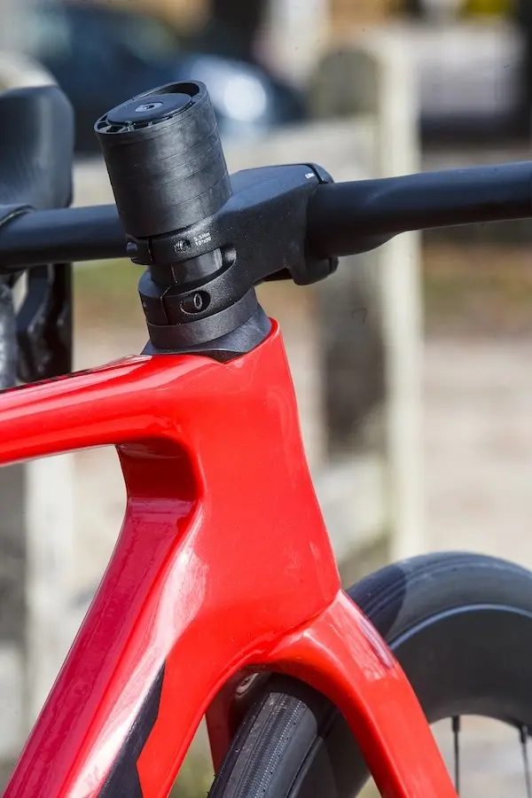Malgré l’intégration des durites de frein, les réglages de position sont assez faciles d’une part grâce au cintre réglable à l’intérieur de la potence, d’autre part grâce aux entretoises placées sous la potence, composées de deux parties qui s’emboîtent. Il est ainsi possible de monter ou de baisser le poste de pilotage sans enlever totalement la potence du pivot de fourche, et sans bien sûr avoir à démonter les durites de frein. On peut également changer la potence aisément. Ces mêmes durites cheminent en avant du pivot de fourche, lui-même en forme de D, ce qui rend par ailleurs impossible de monter la potence de travers par rapport à la roue avant. Elle est donc toujours dans l’axe.