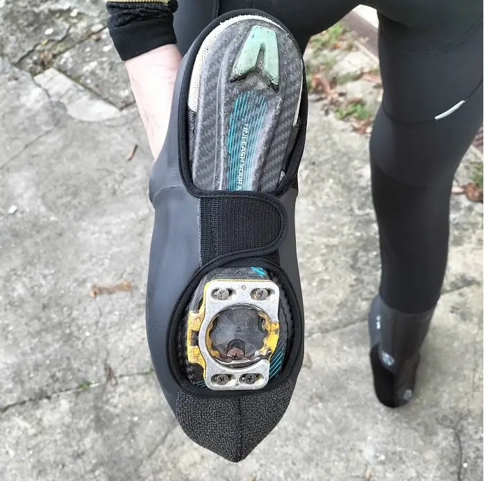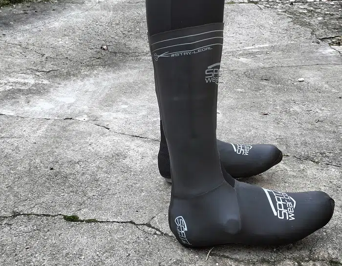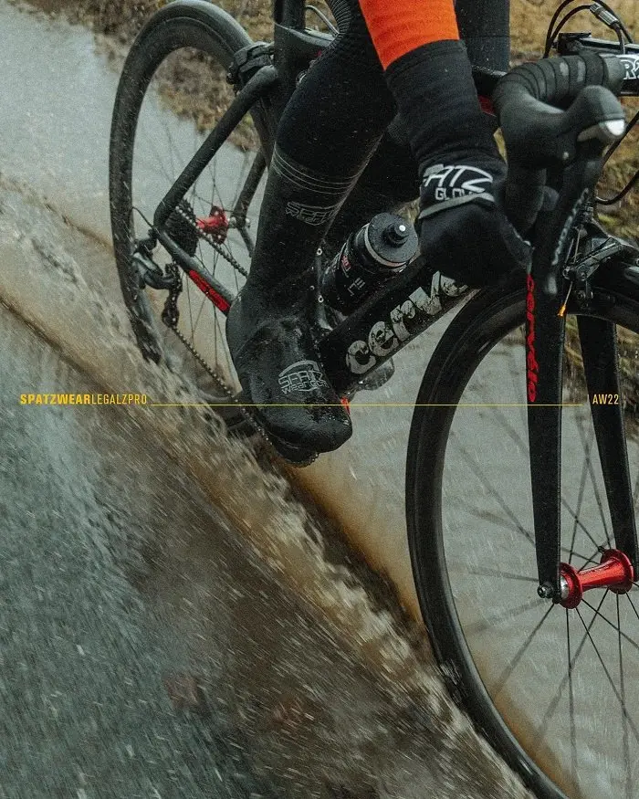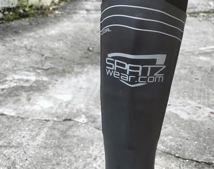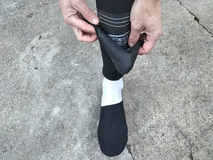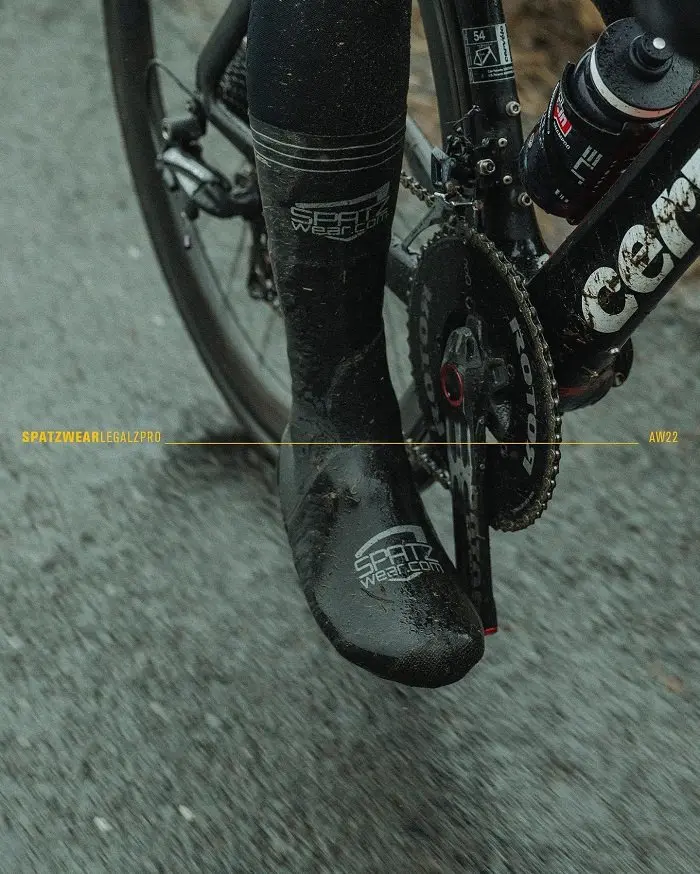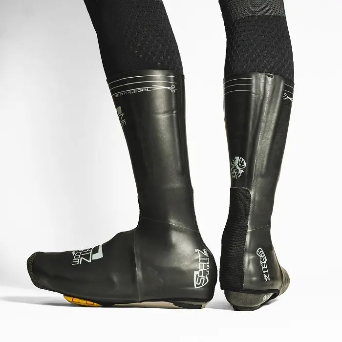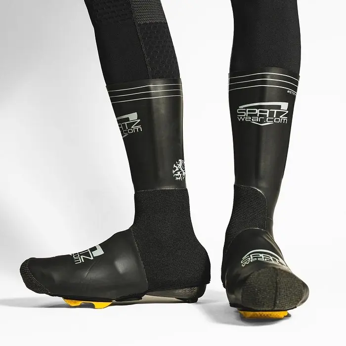 Alors que la plupart des surchaussures arrivent au mieux légèrement au-dessus de la cheville, les Spatzwear Legalz s’étendent jusqu’à mi mollet voire un peu plus haut. L’idée derrière cette coupe particulière est évidemment de retarder ou mieux, d’éviter que l’eau ne coule sur l’avant du collant (dans des conditions où le thermomètre indique moins de 15°C environ) puis dans la surchaussure elle-même. La hauteur du modèle Legalz peut être conservée pour l’entrainement ou réduite afin qu’elle ne soit ajustée pour faire des courses labellisée UCI (d’où le nom « Legalz »). Cette hauteur est matérialisée sur la surchaussure.