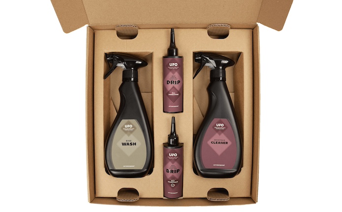 - UFO Bike Wash (nettoyant pour vélo) : il s’agit d’un savon moussant écologique pour vélo, testé et approuvé pour toutes les surfaces. Ce produit de lavage peut être utilisé à l’intérieur comme à l’extérieur et ne contient aucun parfum ni aucune substance odorante. Contenant de 500 ml avec pistolet réglable. Prix à l’unité : 22 €