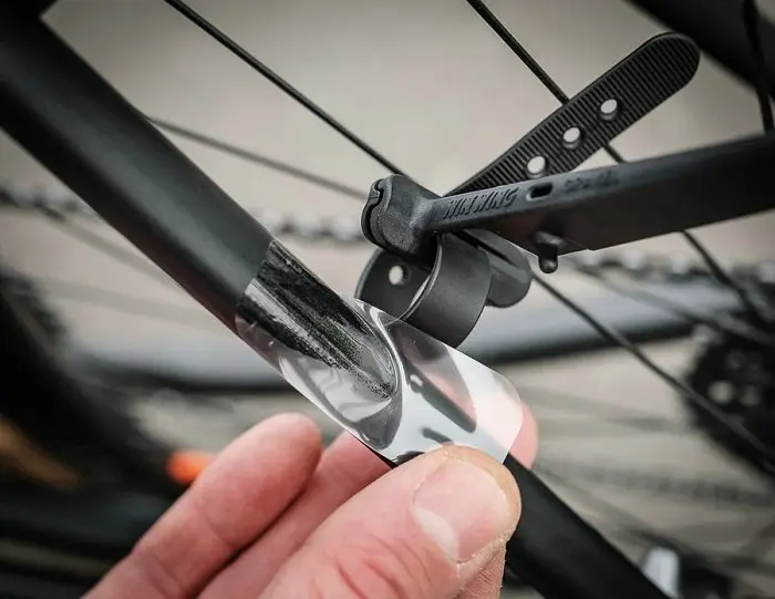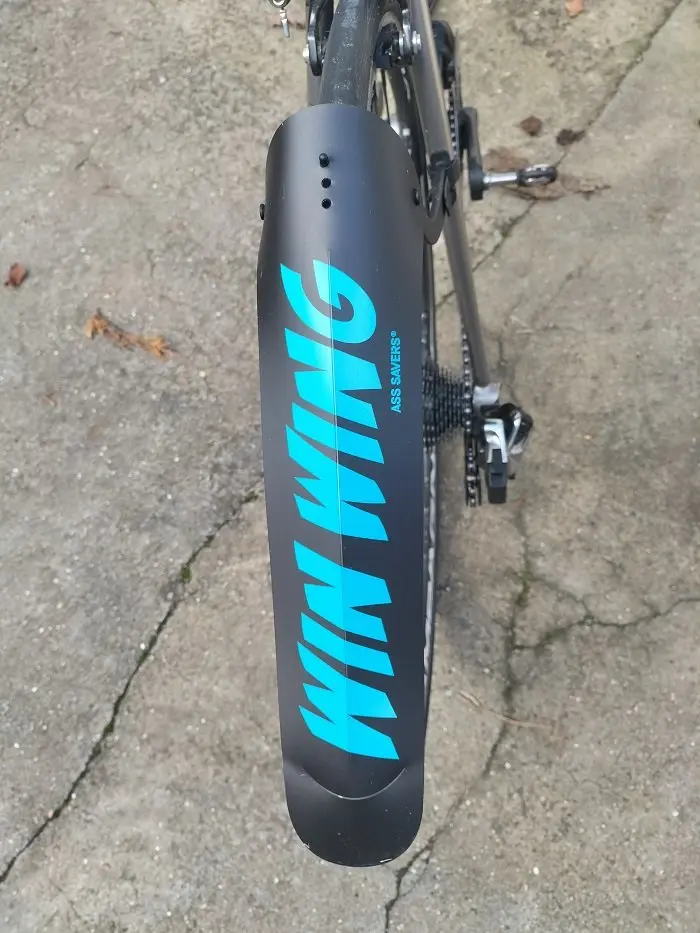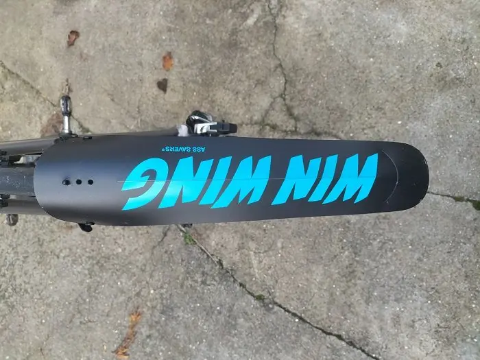 Cette fois, la marque Ass Savers arrive avec un modèle (le Win Wing) à la conception différente : son placement ne se situe pas au même endroit (ici, il se trouve très proche du pneu arrière) et son concept est ainsi de bloquer les projections au plus tôt dès la sortie de la roue. A ce sujet, de nombreux utilisateurs font le montage de cet accessoire en le plaçant parallèle au sol, voire légèrement montant sur la partie arrière. J’ai préféré faire suivre le garde-boue au plus près de la roue (voir photo ci-dessous) pour « bloquer » les projections au plus tôt et éviter de les envoyer dans la roue et les roulements du moyeux. Ce procédé permet aussi de limiter d’arroser les compagnons de sortie placés dans le sillage de la roue arrière.