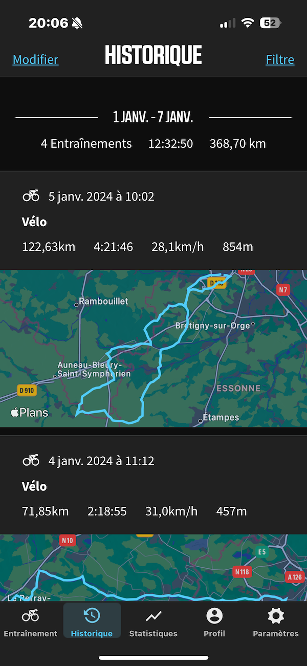 Du côté des entrainements structurés proposés par l’Elemnt Roam, TrainderRoad, TrainingPeaks et Today’s Plan sont entièrement intégrés au compteur. Il est possible de consulter un plan d’entraînement, le suivre et renvoyer automatiquement les données vers les différentes applications. Sur un home-trainer Wahoo Kickr, la résistance est automatiquement modifiée pour correspondre à la puissance cible de chaque intervalle. Ce sont des fonctions que je n’ai pas testées et que je n’utilise pas habituellement.