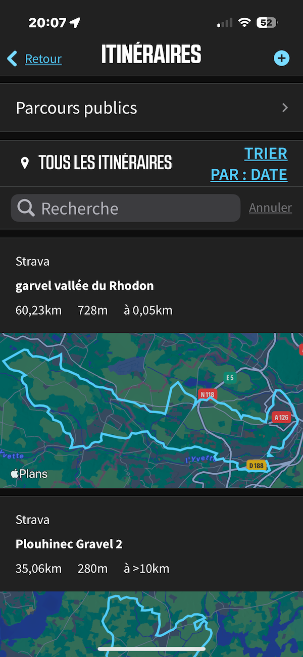 Pour suivre un itinéraire, il est très facile d’intégrer un parcours depuis une plateforme comme Strava. Il suffit de créer un parcours, de l’enregistrer, et celui-ci est automatiquement synchronisé avec l’application Wahoo et envoyé au compteur dans les secondes suivantes. Il est aussi bien sûr possible de créer un itinéraire depuis un fichier, d’un parcours précédent, de revenir au point de départ ou de placer un emplacement sur la carte. Mais dans ce dernier cas, il faut passer par le smartphone, car il n’est pas possible de rentrer une adresse directement sur le compteur par exemple.