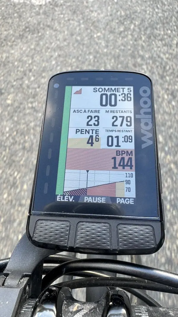 Pour revenir aux boutons, celui du côté gauche permet d’allumer et d’éteindre le compteur avec une pression longue, ou de revenir en arrière dans un menu avec une pression courte. Les trois boutons de la face avant permettent de démarrer une activité, de la mettre en pause ou de la terminer, de lancer un temps intermédiaire ou de changer de page. C’est toujours très clair et il est quasiment impossible de se tromper. Contrairement à Garmin en revanche, on ne peut faire défiler les pages que dans un sens. Je roule habituellement avec six pages différentes (général, dénivelé, carte, puissance, segments, tour intermédiaire). Il me faut donc appuyer six fois de suite sur le bouton pour revenir à la page principale.