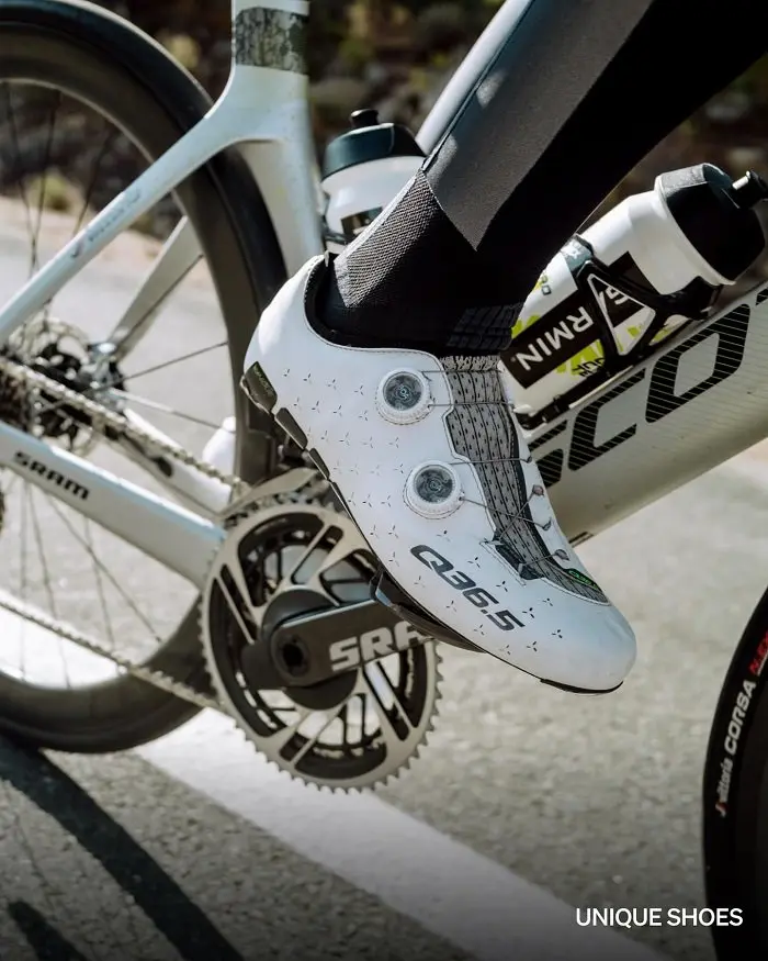 Contrairement à la saison précédente, l’équipe courra à la fois avec les chaussures Unique, ainsi qu’avec les nouvelles chaussures Dottore Clima, un autre ajout révolutionnaire du Q36.5 LAB. Cela est lié à l’étude de Q36.5 sur le système « à 3 points de contact » – où ils optimisent les trois points de contact qu’un cycliste a avec son vélo à travers les chaussures, le cuissard et les gants – ce qui entraîne des gains marginaux grâce à un transfert de puissance et un confort optimal.