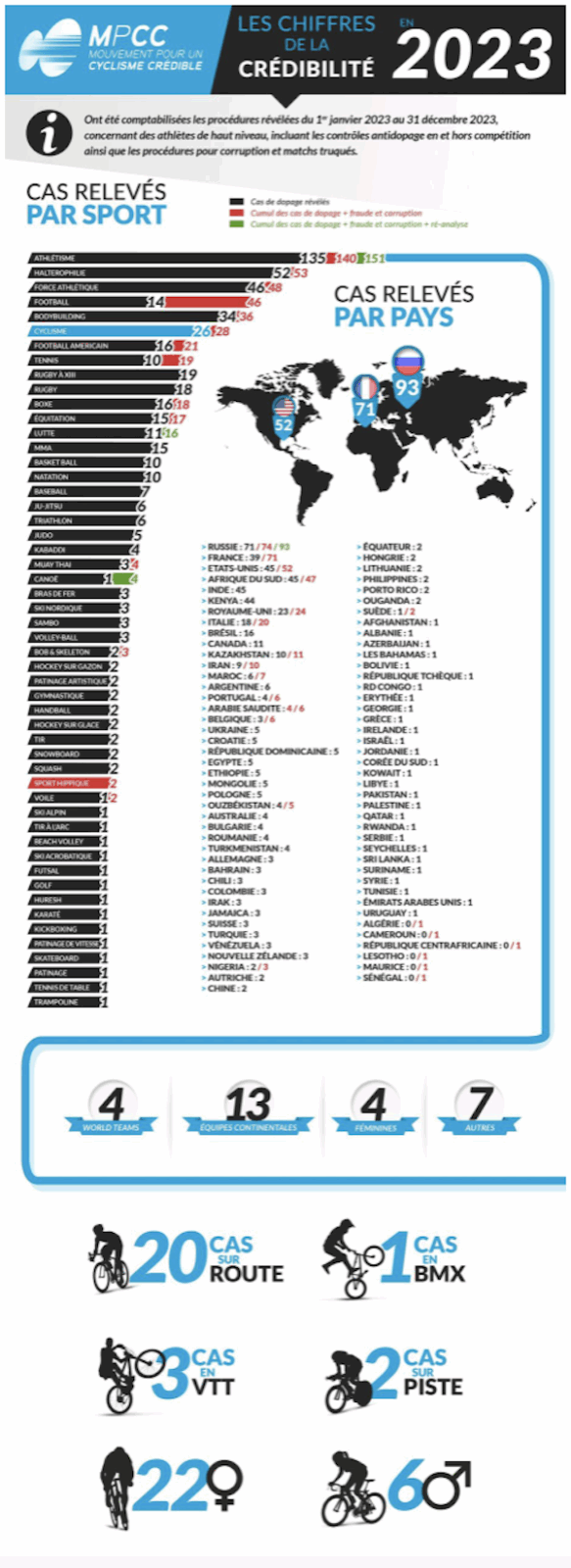 À l’occasion du bilan 2023 des « Chiffres de la Crédibilité », le MPCC prend note de la trentaine de cas de dopage révélés dans notre sport. Malgré ce chiffre stable par rapport à 2022, le groupement rappelle qu’il est plus que jamais légitime dans la lutte contre le dopage.