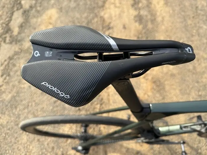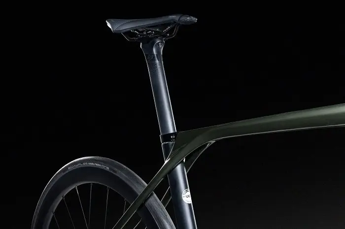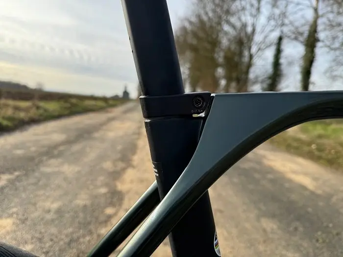 Le tube de selle est « isolé » du reste du cadre et ceci lui permet théoriquement une certaine flexion puisqu’il n’est pas joint aux haubans. Ceux-ci se raccordent ici dans le tube supérieur plutôt que de se connecter au tube de selle. Ceci est une alternative originale parmi la production moderne en face des devenus classiques haubans abaissés.