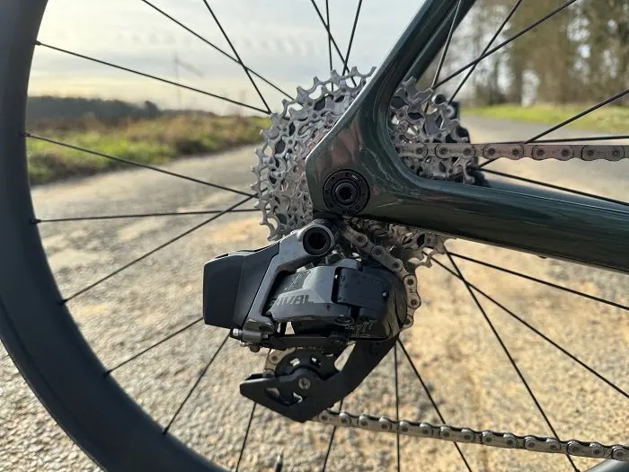 Un aspect peut perturber lors des premières sorties, voire au-delà selon ses préférences : le choix des braquets. Le vélo d’essai est ainsi monté avec une combinaison de plateaux 48/35 et une cassette 10/36. Si la fourchette de développements est idéale pour la haute montagne, sur des reliefs moins escarpés les ruptures de cadence au passage d’un pignon à l’autre sont parfois perturbants lorsque l’on s’approche de ses propres limites physiques. Il faut alors choisir entre un braquet « trop petit » et un autre « trop gros ».