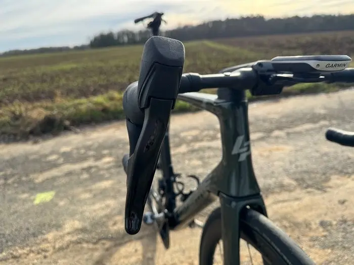 Quand la pente se fait négative, il n’y a guère que le freinage issu du groupe Sram Rival qui ne répond pas aux attentes : avec une course au niveau du levier de frein plutôt spongieuse dont une partie de cette course est « morte », les petits ralentissements tout comme les forts freinages se montrent difficiles à doser. L’utilisateur sait que ça peut freiner faiblement ou fortement mais il a du mal à prévoir les deux actions. Pour une pression constante sur le levier, le ralentissement n’est lui-même pas constant. Autre exemple, dans un peloton où de faibles corrections sont parfois suffisantes mais nécessaires, la longue course du levier rend le procédé un peu perturbant. Et quand il est demandé au vélo de freiner le plus fort possible sur une courte distance, typiquement avant un virage en épingle la sensation spongieuse ne permet pas de reproduire systématiquement les meilleurs décélérations possibles. Pour le reste, et bien qu’il ne soit hiérarchiquement que le troisième groupe du fabricant américain, le Sram Rival n’apporte que des satisfactions avec des changements de vitesses rapides et précis, que ce soit pour les pignons ou les plateaux.