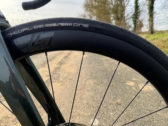 Le confort est bien présent, malgré la présence de pneus en 25 mm de section « seulement » pour les standards d’aujourd’hui. Cependant la largeur des jantes les ferait presque passer pour du 28 mm. Leur grip s’est également montré impérial, que ce soit sur le sec comme sur le mouillé. À noter deux crevaisons (une pour chaque roue) lors de la toute dernière sortie pour ce test. Seule la première a pu être colmatée par le liquide préventif contenu à l’intérieur du pneu. Pour la deuxième, le trou était trop important pour être rebouché mais la proximité avec la maison (1 km) et le reste de pression a permis de rentrer sans soucis.