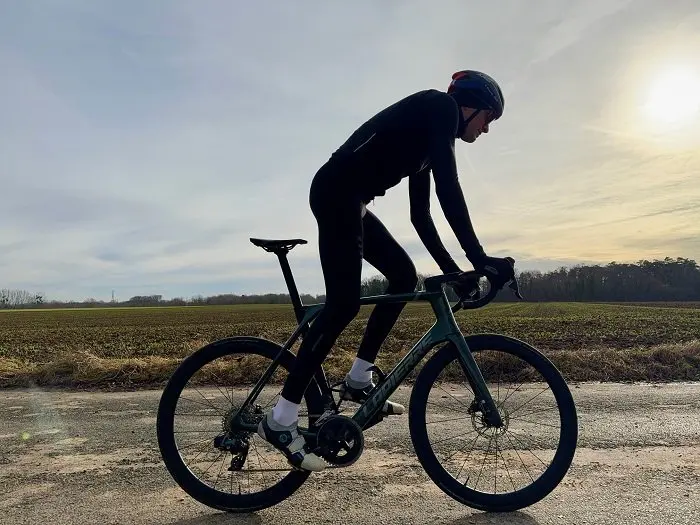 Dès les premiers coups de pédale, la rigidité est présente mais pas excessive. Le vélo dans son ensemble ne fléchit pas mais il ne semble pas inerte pour autant et il s’agit là d’une vraie bonne surprise dans la mesure où son orientation vers la vitesse et sa capacité à satisfaire un coureur comme Arnaud Démare faisait craindre le « pire » quant au côté accessible du comportement. Sa rigidité semble également très homogène et parfaitement répartie entre la partie avant (douille) et la partie milieu/arrière (boitier surtout et bases). Cette homogénéité le rend très agréable et finalement plutôt facile à emmener même en roulant en allure endurance. Cet aspect se confronte à d’autres vélo comme le Cervélo R5 testé testé l’année dernière dont la douille très rigide dénotait presque face à la rigidité au niveau du boitier et réclamait même une gestuelle adaptée au moment de se lever de la selle. Ici à l’inverse, il n’est pas nécessaire de modifier son geste en se mettant en danseuse.