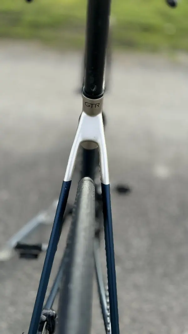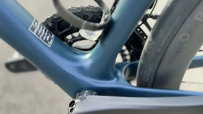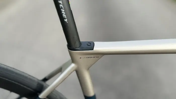 Pour ceux qui se demandent ce qu’est ce petit triangle de matière qui se trouve sous l’angle du tube de selle et du tube horizontal, c’est l’endroit où se loge une pièce qui fait office de serrage de la tige de selle par compression, tout comme sur le Fraxion. Le serrage est recouvert d’un cache en caoutchouc qui procure une finition épurée, comme sur le reste du vélo d’ailleurs.