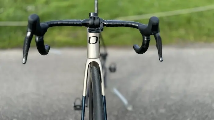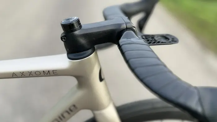 Confortable mais pas mou, rigide mais pas bridé, stable mais toujours maniable, l’Axxome III procure un équilibre général qui le rend d’emblée très attachant. Dès la première sortie à son guidon, je suis parti pour 140 km, chose que je ne fais jamais avec un vélo de test, au moins le premier jour. Je m’attendais à avoir un peu de mal à prendre mes marques, avec un poste de direction un poil trop haut pour moi dans cette taille S, mais je me suis pourtant tout de suite trouvé bien dessus. L’Axxome est un vélo qui doit rester accessible au plus grand nombre, et pour ce faire, le fabricant a choisi de conserver une géométrie qui offre une position un peu moins agressive que certains modèles concurrents. Cependant, j’ai vite apprécié la forme du cintre, qui présente ici l’avantage d’être réglable pour trouver une bonne manière de se caler sur le vélo.