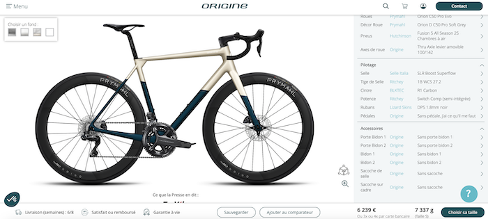 Même si le choix de la couleur du vélo de test est discutable (et elle n’est pas de notre fait !), tout est configurable en matière de coloris chez Origine, les vélos étant peints en France dans l’usine de Rouvignies dans le Nord. Au moment du choix du vélo, vous pouvez sélectionner parmi de nombreuses couleurs sur le configurateur, et même des options majorantes ou minorantes au niveau des groupes, roues ou périphériques, avec une mise à jour systématique du prix et du poids du vélo. Ainsi, sur le configurateur, la version exacte du vélo de test est donnée pour 7337 g en taille S (sans pédales ni porte-bidon). Et pour notre part, nous avons pesé le vélo à 7320 g dans cette configuration, soit 7,717 kg avec pédales Garmin, deux porte-bidons, et les supports de compteur et de radar arrière (et avec un grand plateau Rotor, plus grand que celui fourni avec le vélo). Une belle performance de justesse, même s’il ne faut pas oublier que le vélo coûte 6239 €, et que pour à peine plus cher (6800 €), le précédent Axxome GTR en Shimano Dura-Ace pesait 6,8 kg sans pédales fin 2018 !