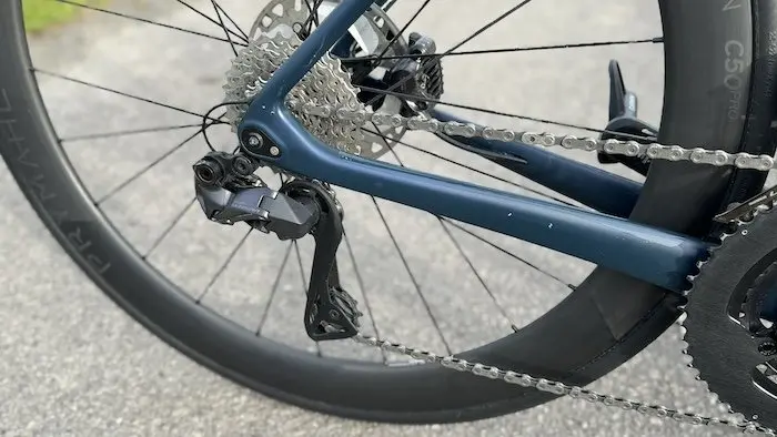Pour ce qui est du confort, la marque s’appuie sur un nouveau triangle arrière nommé CCT+ (Continuous Carbon Tubing), avec des bases et haubans reliés en un seul tube de carbone continu, sans point dur entre le boitier et le puits de selle, de manière à diffuser les imperfections de la route sur toute la longueur de ce tube continu. D’après la marque, l’Axxome III offrirait même jusqu’à 12 % de filtration des vibrations en plus que la précédente version. Et pour améliorer encore le confort du vélo, celui-ci est désormais compatible avec des pneus de 35 mm de section, ce qui lui permet même, le cas échéant, d’affronter des sections mal pavées ou des pistes de Gravel léger. À noter que l’Axxome III GTR se distingue du GTO qui offrirait encore plus de confort et de facilité même après de nombreuses heures de selle, mais un peu moins de nervosité dans les phases d’accélération.