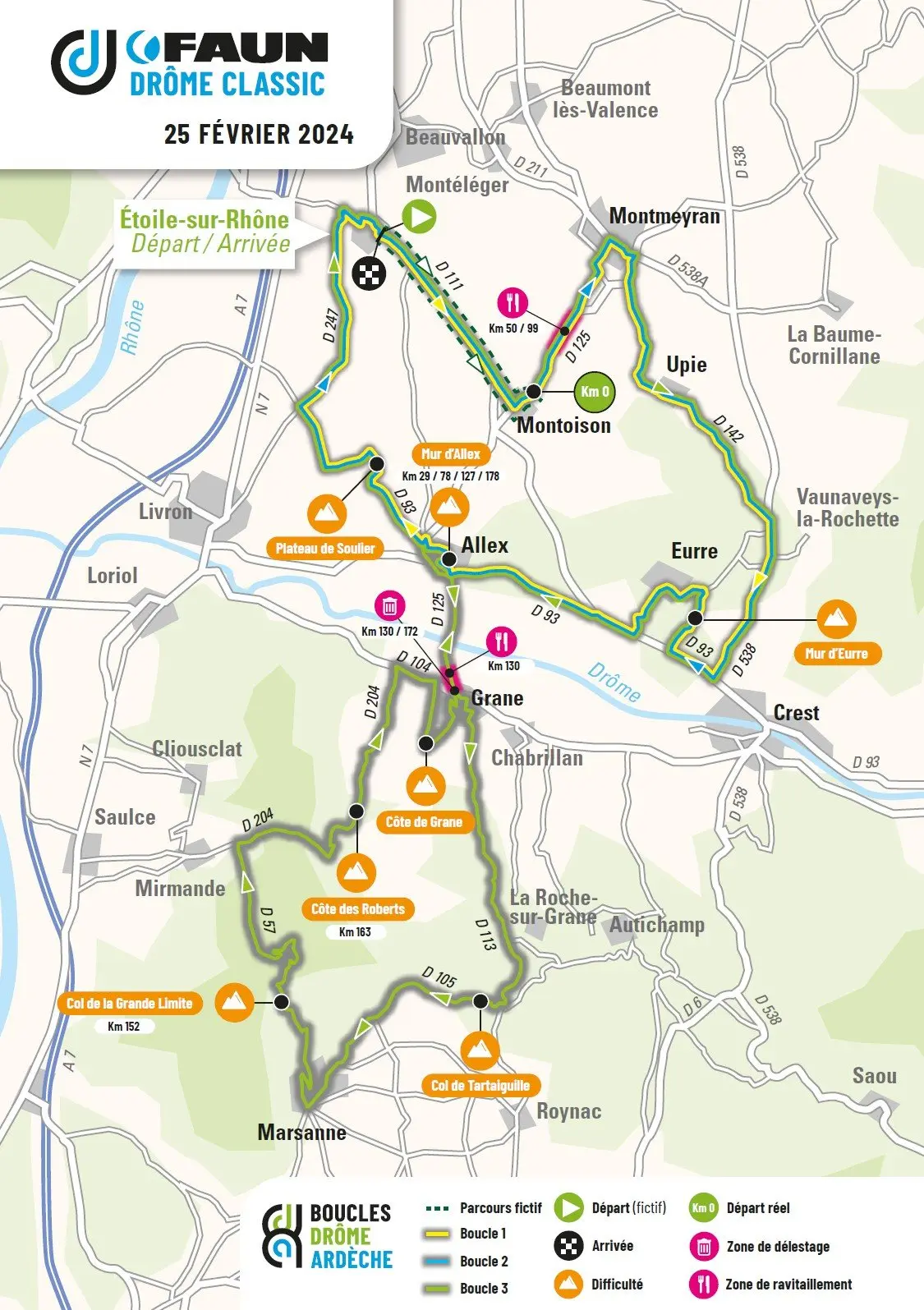 La 12ème édition de la Faun Drôme Classic se déroule dimanche 25 février 2024 au départ d’Étoile-sur-Rhône. Au lendemain de l’épreuve ardéchoise, les coureurs vont s’affronter sur un parcours escarpé de 191,5 km et 2 400 mètres de dénivelé positif. Le peloton traversera les villages perchés de la Drôme et devra gravir plusieurs côtes redoutables, dont le désormais célèbre mur d’Allex. Le Français Anthony Pérez (Cofidis), vainqueur en 2023, est au départ pour tenter de réaliser le doublé. Pour suivre l’épreuve dans les meilleures conditions, retrouvez les détails du parcours, la liste des engagés et les horaires de diffusion TV.