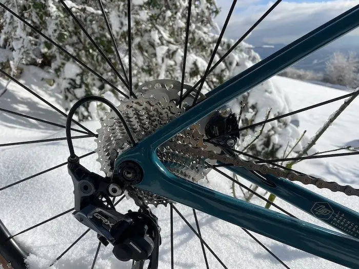 Autour d’un cadre tout en carbone HR (Haute Résistance), on trouve un groupe Shimano GRX810, la transmission et le freinage Gravel par excellence. Il bénéficie ainsi des caractéristiques parfaitement adaptées à l’esprit de ce vélo. Même si nous avons déjà été impressionnés par le groupe Shimano GRX 12 vitesses, ce groupe 11 vitesses reprend bon nombre de ses qualités. À noter que le 12 sera monté sur le millésime 2024 !