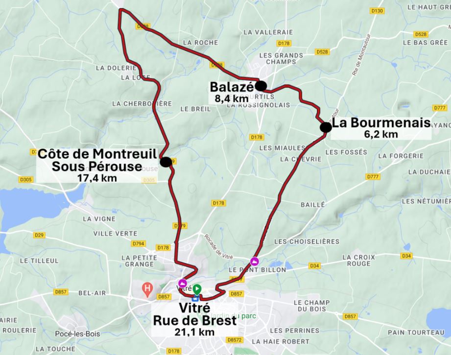 Les coureurs de la Route Adélie de Vitré ont 176,7 km à parcourir. La distance est répartie sur deux circuits dessinés sur la partie nord de Vitré.
