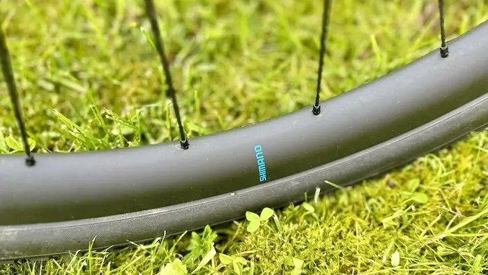 Avec un poids de 1437 g avec les rubans de jante et les valves tubeless, la paire de Shimano RX880 est particulièrement légère pour des roues de Gravel, au même niveau que de nombreux modèles haut de gamme pour la route. Les jantes en carbone ont un profil de 32 mm, pour une largeur interne de 25 mm. Mes tubeless de 38 mm de section mesurent en réalité 41 mm de large une fois montés sur ces roues. Elles sont compatibles avec les pneus jusqu’à 50 mm de section avec ou sans chambre, et c’est bien sûr ce montage tubeless qui s’avère le plus intéressant pour une pratique tout-terrain. Avec une pression de gonflage de 2 à 2,2 bar pour ce qui me concerne, l’ensemble assure confort, motricité et adhérence dans de nombreuses situations.