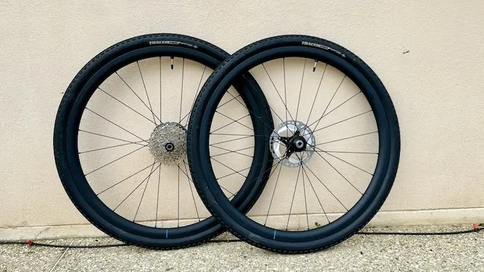 Cependant, il est nécessaire de préciser que le gain de poids d’une paire de roues de Gravel n’est pas aussi sensible qu’avec des roues de route, tout simplement parce que si l’on tient compte des mêmes pneus (environ 500 g l’unité, auxquels il faut rajouter 60 g de liquide préventif pour ce qui me concerne) et de la même cassette (de 11 à 34 dents en 12 vitesses à 345 g), l’avantage est ici noyé dans la masse globale des roues montées. Dans les pentes raides sur une surface fuyante, le comportement du pneu relève d’une importance prépondérante par rapport au dynamisme des roues.