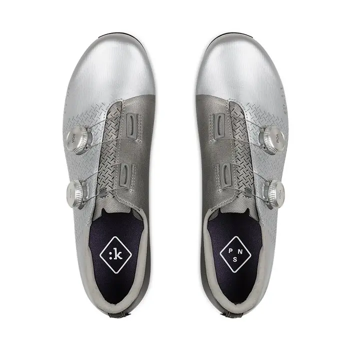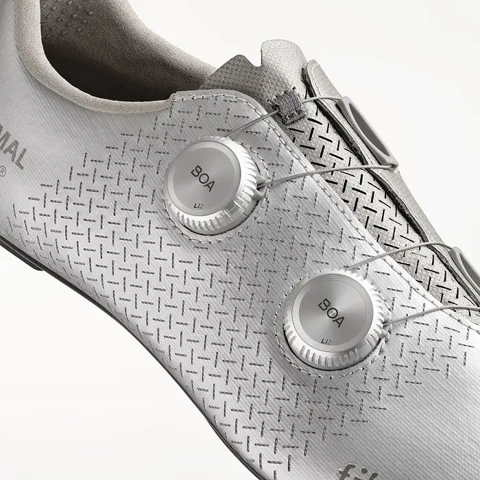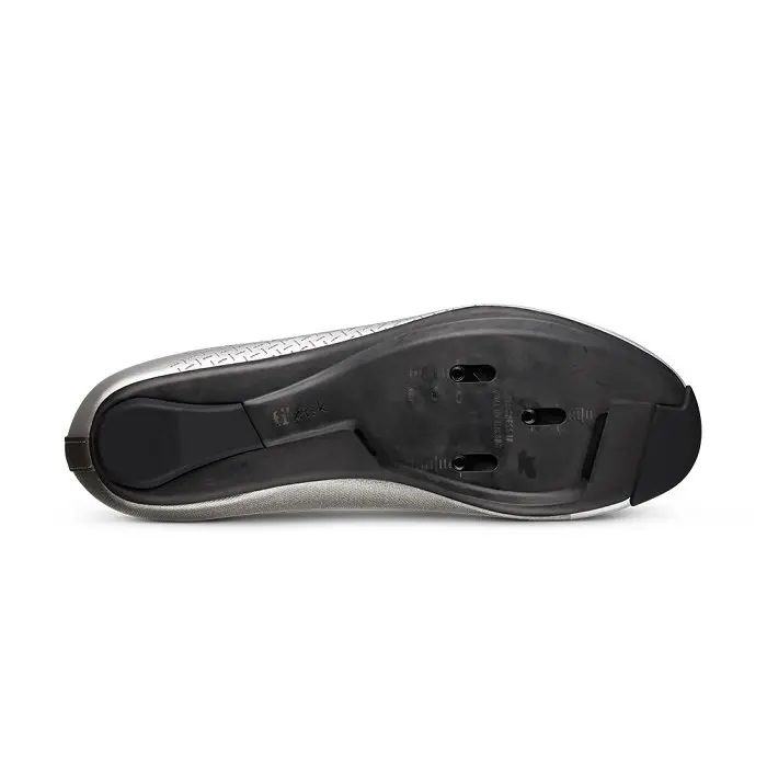 À la base, la semelle extérieure R2 de Fizik est dotée d’une structure en fibre de carbone qui permet d’économiser du poids et d’offrir une rigidité accrue, avec un indice de rigidité de 10, ce qui fait de cette semelle extérieure la plus rigide de la gamme Fizik. Une large entrée d’aération et des canaux internes assurent un flux d’air, facilitant ainsi la régulation de la température durant les sorties. Le positionnement des cales est légèrement plus en retrait par rapport aux réglages traditionnels pour optimiser l’efficacité du pédalage et réduire la compression du genou, particulièrement adapté aux positions aérodynamiques avancées très agressives adoptées par les compétiteurs.