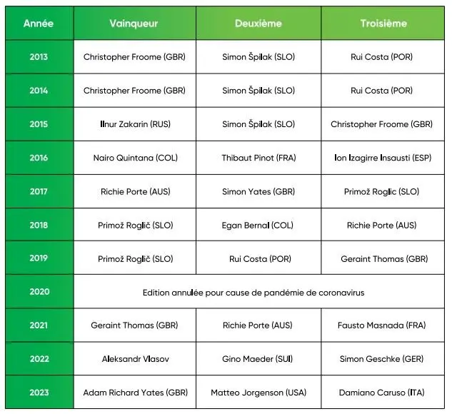 Les 10 derniers vainqueurs du Tour de Romandie