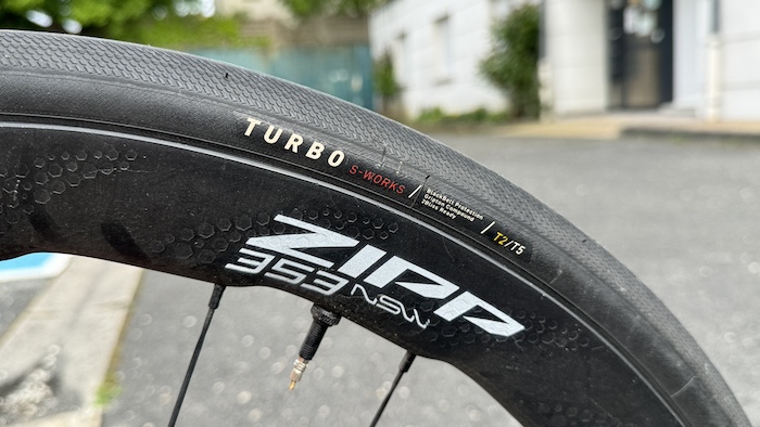Proposé avec des flancs noirs en trois sections (700×26, 700×28, 700×30) ou avec des flancs marrons (en 28 et en 30), il est vendu au prix de 75 € l’unité. Le modèle reprend la même structure que le pneu pour chambre à air S-Works Turbo, avec une carcasse en 120 TPI ainsi qu’une chape bi-composant en Grifton T2 sur la bande de roulement pour le rendement et la durabilité, et en Grifton T5 sur les épaulements pour l’adhérence, notamment sur sol mouillé. Il bénéficie également d’une protection Blackbelt, placée sous la bande de roulement. Enfin, le pneu est compatible avec les jantes avec et sans crochet. C’est d’ailleurs avec ce dernier type de roues que j’ai pu tester les S-Works Turbo 2BR, montés sur des Zipp 353 NSW, gonflés constamment à une pression entre 4 et 5 bar (maximum car le système ne supporte pas de pression supérieure) pour une section de 700×28. La section réelle de ce pneu est d’ailleurs de 31 mm sur cette jante large de 25 mm de largeur interne.