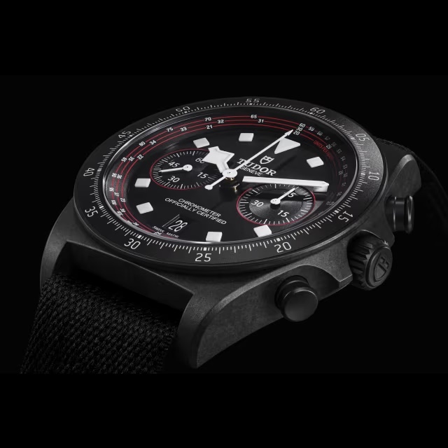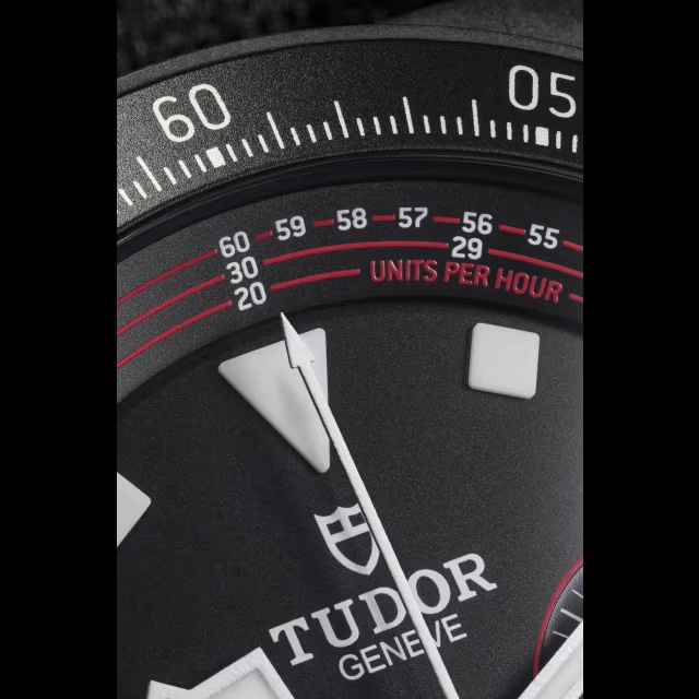 Le cadran noir mat de la Pelagos FXD Chrono « Cycling Edition » met l’accent sur la lisibilité. Ses index carrés, éléments caractéristiques de l’esthétique TUDOR depuis les années 1960, alors introduits pour obtenir une plus grande surface lumineuse, sont façonnés dans un composite de céramique luminescent qui garantit une lecture optimale, d’un coup d’œil, même en conditions de course. Les aiguilles angulaires historiques de TUDOR, surnommées « Snowflake », participent de la même intention fonctionnelle. Des touches rouges rappellent quant-à-elles les couleurs du TUDOR Pro Cycling Team, notamment une échelle tachymétrique recalibrée pour la pratique du vélo et apposée sur le réhaut incliné à 45° sur le pourtour du cadran.