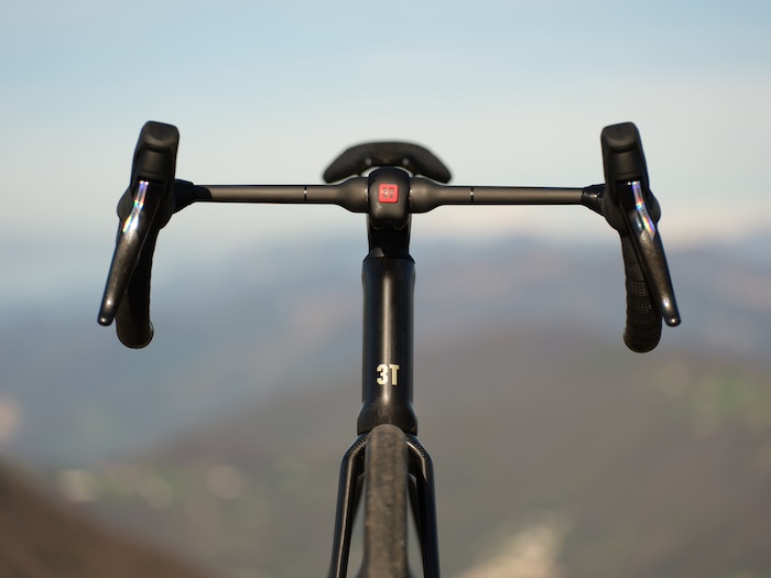 Chez 3T, confort et aérodynamisme vont de pair. Un vélo aérodynamique est inutile si le cycliste ne peut pas rester dans une position aérodynamique. Sans le bon ajustement, cela devient une corvée impossible. Le choix du poste de pilotage et la flexibilité jouent ici un rôle important. 3T a utilisé sa technologie Integrale, son cintre en carbone Aeroflux et sa potence en carbone MORE pour permettre au cycliste de trouver la meilleure position tout en dissimulant les durites de frein hydrauliques en interne.