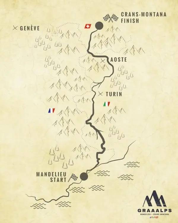 Du 16 au 21 Juillet 2024, GRAAALPS tracera une aventure extraordinaire, inaugurant le tout premier événement ultra-distance Gravel entre Mandelieu-La Napoule et Crans-Montana. 750 km et 20 000 m de D+ : partant des rivages enchanteurs de la Côte d’Azur, traversant les Alpes à travers trois pays, pour atteindre Crans-Montana face aux légendaires 4000 m du Valais, cette traversée promet une expérience inoubliable.
