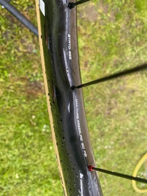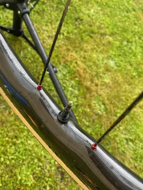 Les rayons SHR made in Europe également, bien que plus conventionnels, offrent une fiabilité éprouvée et une facilité de remplacement en cas de nécessité, ce qui est un avantage certain. Ils sont ligaturés sur la paire que nous avons eu en test, ce qui confirme l’attention portée aux détails et à la qualité de fabrication. Sur le plan esthétique, il est intéressant de noter que les têtes de rayon rouges sont judicieusement placées autour de la valve, ajoutant une touche de couleur subtile mais distinctive à l’ensemble.
