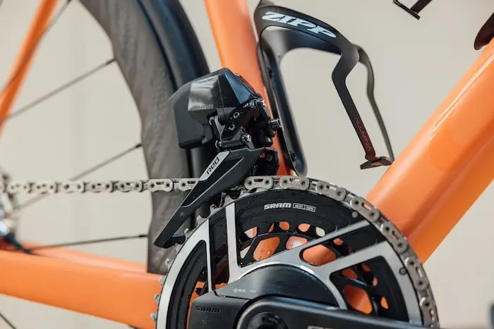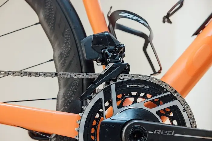 Je n’ai pas utilisé le Sram Red AXS de façon extrême, mais j’ai toutefois pu mesurer l’usure de la chaîne après 4 000 km grâce à un outil dédié, et j’ai vu avec surprise qu’elle était presque comme neuve ! Aucun allongement constaté, ce qui ne m’était jamais arrivé sur aucune chaîne après ce kilométrage. J’estime sa durée de vie (dans les mêmes conditions) à au moins 8 000 km. Pas mal pour du 12 vitesses. Mais en rapport avec le prix, très élevé pour ce type de composant.