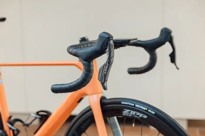 L’ensemble poignées/freins avec les durites est annoncé avec un poids plus léger de 83 g sur la paire que le Sram Red précédent. Une avancée spectaculaire, réalisée en améliorant le confort et l’efficacité. Un grand bravo sur ce point à la marque américaine. Et j’ajoute que bien que le système soit allégé, il ne produit aucun bruit de vibration ou de claquement, et offre une sensation vraiment haut de gamme à l’utilisation.