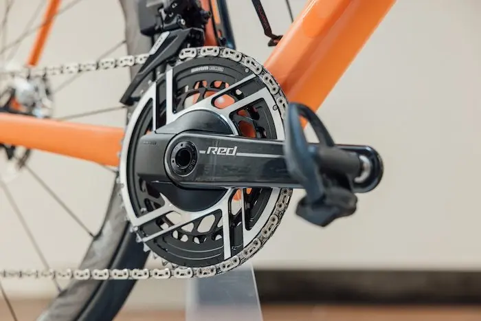 Le pédalier Sram Red AXS est également disponible en mono, avec un plateau en montage direct, avec 48 ou 50 dents.