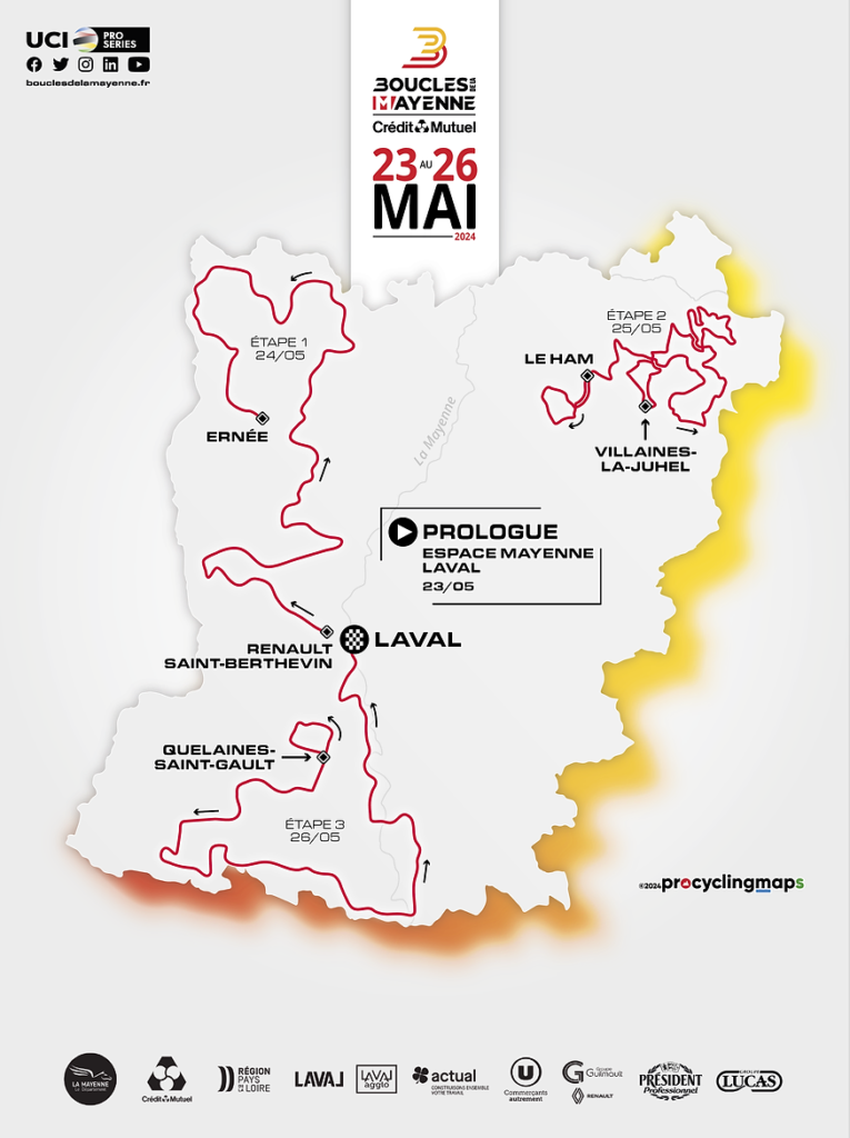 Les Boucles de la Mayenne 2024 se déroulent du jeudi 23 mai au dimanche 26 mai, avec un prologue et trois étapes autour de Laval (53). Marc Hirschi et Diego Ulissi (UAE Team Emirates), Benoît Cosnefroy et Pierre Gautherat (Decathlon AG2R), Alberto Bettiol et Stephan Bissiger (EF Education First), Rémy Cavagna (Movistar) ou Alex Zingle (Cofidis) font partie des principaux favoris. Retrouvez le parcours et les horaires de cette 49e édition des Boucles de la Mayenne.