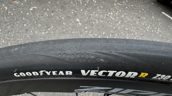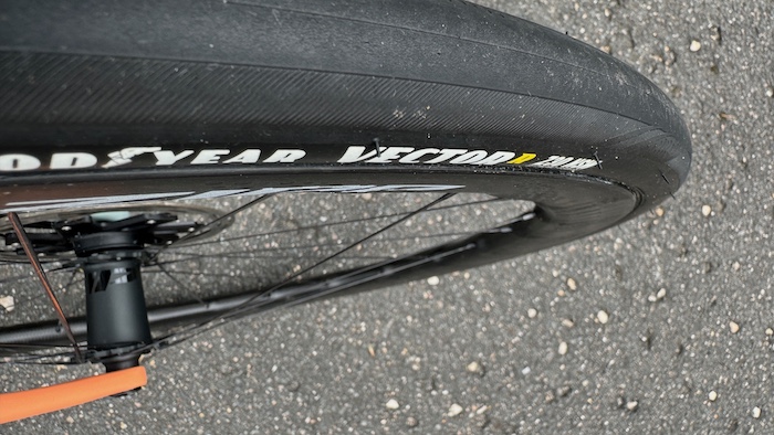 Je m’attendais à pouvoir réaliser un test longue durée de la paire de pneus Goodyear VectorR Z30 NSW en même temps que celui du groupe Sram Red AXS. J’ai roulé en effet pendant un peu plus de deux mois avec un Orbea Orca OMX équipé du nouveau groupe Sram, avec des roues Zipp 353 NSW, et donc au départ des pneus Vector. Les premières impressions sur les routes escarpées des collines du Prosecco et sous une météo fraîche et humides ont été très favorables. J’ai pu apprécier le rendement très élevé des pneus, ainsi qu’une tenue de route de très bon niveau, même sous des trombes d’eau. Le confort a semblé se montrer également à la hauteur des promesses de Zipp : associés aux roues de 25 mm de large et avec une pression de gonflage autour de 4,5 bar, le vélo ainsi équipé absorbe beaucoup de petites vibrations et laisse l’impression de rouler constamment sur un tapis feutré. Et malgré sa section importante et une pression moyenne, le pneu ne s’écrase par au niveau des flancs lorsqu’on roule en danseuse ou lorsqu’on se lance dans une franche accélération.