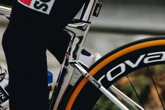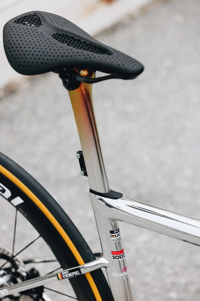 Pour cette deuxième partie de saison, Specialized a décidé de préparer un coloris spécial pour le vélo du coureur belge de l’équipe Soudal-Quick Step. « Un vélo n’est qu’un vélo jusqu’à ce que le bon athlète monte dessus. Ici, les zones de peinture fondues qui évoquent le fer proviennent des points de contact de Remco. Le haut de la tige de selle, le boîtier de pédalier et le poste de pilotage brillent tous d’une perle de couleurs fondues. Au fur et à mesure que l’énergie de Remco traverse ces zones, le métal commence à prendre forme et à durcir pour donner un chrome fin et enfin une partie avant teintée en noir, rappelant la fonte« , indique Tom Briggs, concepteur graphique principal chez Specialized.