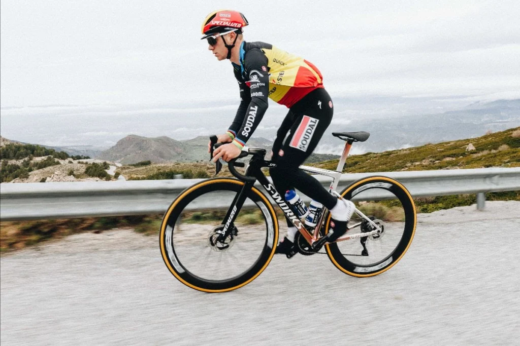 Le cadre du Tarmac SL8 ne pèse que 685 g, et il est destiné à s’exprimer sur l’un des terrains de jeux préférés de Remco Evenepoel : la haute montagne. L’équipe Specialized affirme ne pas vouloir sacrifier les performances pour les graphismes. C’est pourquoi elle a mis au point une technique rigoureuse de peinture appelée PVD (dépôt physique en phase vapeur) qui ajoute moins de poids qu’une peinture classique pour créer l’effet « couleurs fondues ».