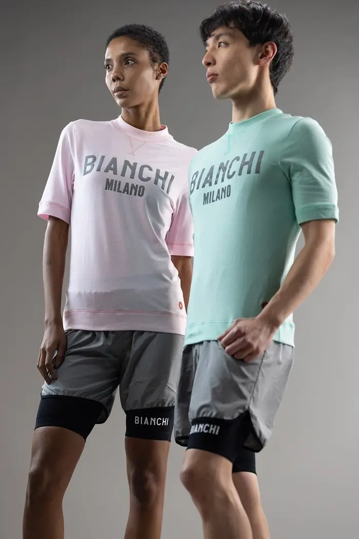 Le polo est disponible en Céleste traditionnel, un rose qui rappelle le maillot de leader du Giro d’Italia, ou en Bleu Vert et Bleu Bordeaux, tous arborant la bande centrale emblématique de Bianchi Milano. Le T-Shirt, disponible en version homme et femme, se décline en rose, Céleste ou écru.