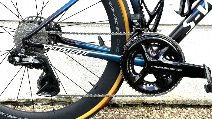 Cependant, avec le temps, j’ai constaté un avantage inattendu à l’usage de cette chape surdimensionnée. Je n’aime pas habituellement rouler avec le petit plateau, surtout avec un 36 dents comme c’est le cas avec la combinaison imposée avec le 52. Par le passé, j’ai toujours préféré les « grands » petits plateaux, avec un 42 quand c’était encore possible, puis un 39. En tombant la chaîne sur le petit plateau, j’ai toujours eu l’impression de tourner autour du pédalier, et de sentir moins de rendement qu’avec un développement équivalent en utilisant un grand plateau et un grand pignon. Sans doute en raison du nombre moins conséquent de dents de la transmission en contact avec la chaîne, et du cheminement de la celle-ci autour du dérailleur. Grâce à cette chape surdimensionnée, la chaîne décrit ici un enroulement plus arrondi autour du dérailleur. Elle est plus tendue et forme moins de battements. La transition entre le grand et le petit plateau s’avère donc plus fluide, et je me surprends régulièrement à ne pas systématiquement chercher à remettre la plaque après un passage ayant nécessité un tout petit braquet. Des sensations que j’ai pu confirmer en alternant les sorties avec un vélo de test, équipé aussi avec la même transmission Dura-Ace, mais sans la chape surdimensionnée. Dans l’ensemble d’ailleurs, je trouve l’ensemble de la transmission plus fluide avec la chape CeramicSpeed, mais il ne s’agit ici que de sensations difficiles à matérialiser en termes de chronomètre.Sur le petit plateau, l’enroulement de la chaîne autour de la transmission décrit des angles moins marqués qu’avec une chape traditionnelle.Les changements de vitesse restent ultra précis.