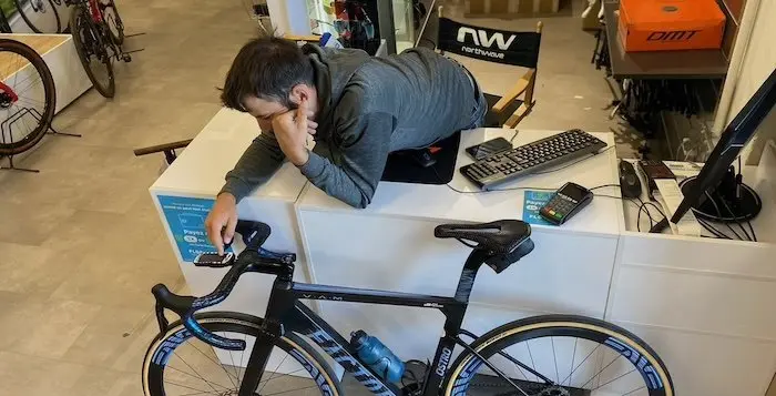 Pour que l’application E-TUBE fonctionne parfaitement avec un groupe Shimano Di2 11 vitesses, il est nécessaire d’installer un dispositif spécifique. Dany Maffeis, du magasin Matériel Vélo, a équipé notre vélo avec le boîtier de connexion sans fil EW-WU111 de Shimano, qui permet la communication entre les composants électroniques et l’application. Ce module compact s’intègre facilement dans le cadre et assure une connexion stable, essentielle pour la configuration et le diagnostic via e-Tube.