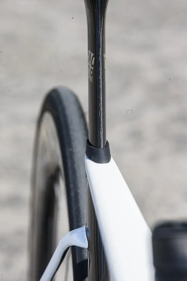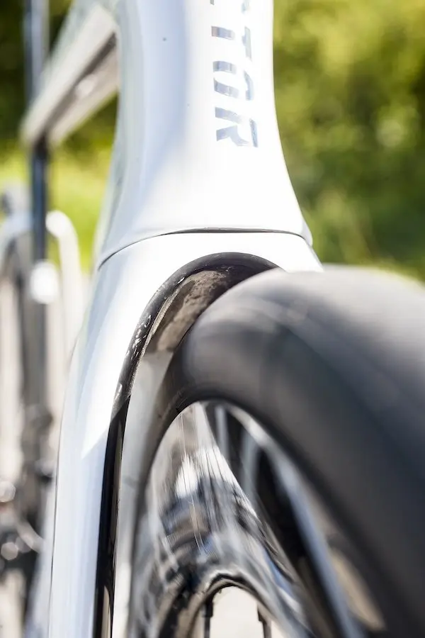Comme sur la plupart des vélos modernes, le profil du nouvel Ostro se distingue donc par une partie avant et une partie basse du cadre avec des tubes plats et larges pour favoriser le transfert de puissance, et plus de finesse autour de la zone liée à l’assise pour un peu plus de confort. Le tout avec des profils et des dimensions de tubes destinés à limiter au maximum les perturbations des flux d’air autour du vélo à grande vitesse. Par ailleurs, l’Ostro VAM accepte des pneus jusqu’à 32 mm de section, de manière à offrir une marge de manoeuvre pour ceux qui recherchent à absorber encore un peu plus les vibrations. Cependant, le vélo et les roues sont étudiés pour fonctionner le plus efficacement possible sur le plan aérodynamique avec des pneus de 28 mm, selon Factor.