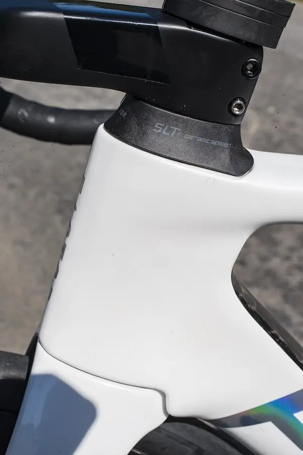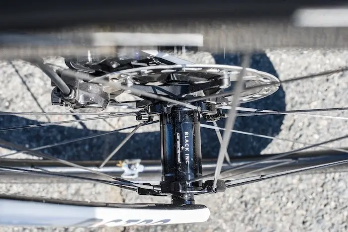 Le poste de pilotage Black Inc. conserve des caractéristiques identiques à la précédente version, elle-même bien plus ergonomique que sur le Factor One essayé en 2019. Il présente un évasement, avec une partie basse 3 cm plus large que la partie haute. La partie basse du guidon est parallèle au sol, ce qui permet de se sentir bien calé avec les mains dans cette position. La partie supérieure se montre longue et plate, et prolonge parfaitement la poignée de frein pour plus de confort. Enfin, la partie haute effectue une légère courbure pour un positionnement naturel des poignets avec les mains en haut du guidon, par exemple lors d’une longue ascension. Les durites cheminent à l’intérieur du guidon et pénètrent dans la douille de direction par l’avant, sans perturber le diamètre de braquage du vélo, ni même la possibilité de la ranger facilement dans un coffre de voiture, comme c’est le cas par exemple avec un Cervélo S5 ou un Cannondale SystemSix. Annoncé autour de 380 g, le cockpit n’est pas particulièrement léger, mais il est en tout cas très rigide.