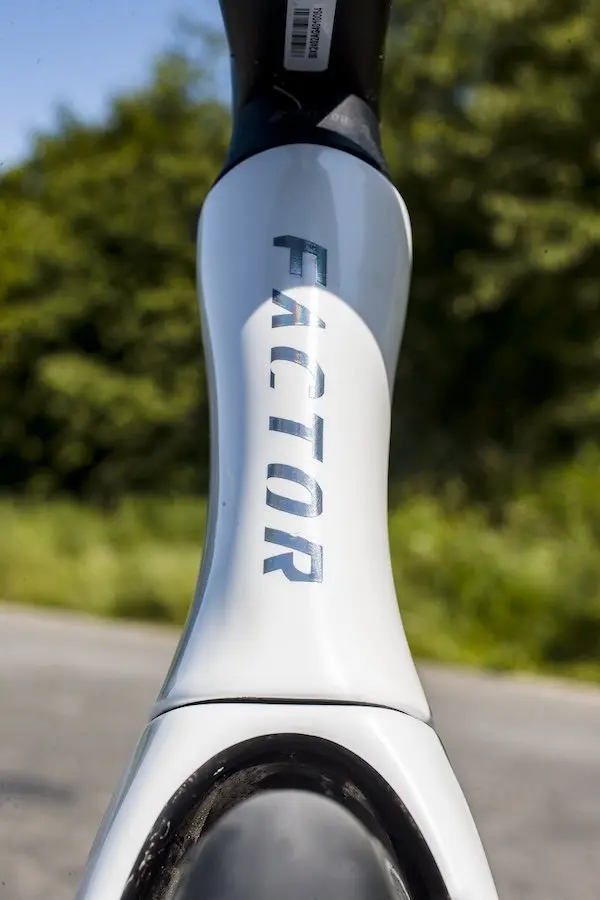 Les principaux gains aérodynamiques ont été obtenus en tirant parti des changements apportés à la réglementation UCI quant aux dimensions des différents tubes du cadre, qui s’affranchissent du fameux rapport 3:1, qui imposait jusque là une longueur des tubes ne pouvant pas dépasser trois fois leur largeur. Factor a ainsi pu élargir certaines parties du cadre et en affiner d’autres afin d’optimiser au mieux le rapport poids/aéro du vélo.