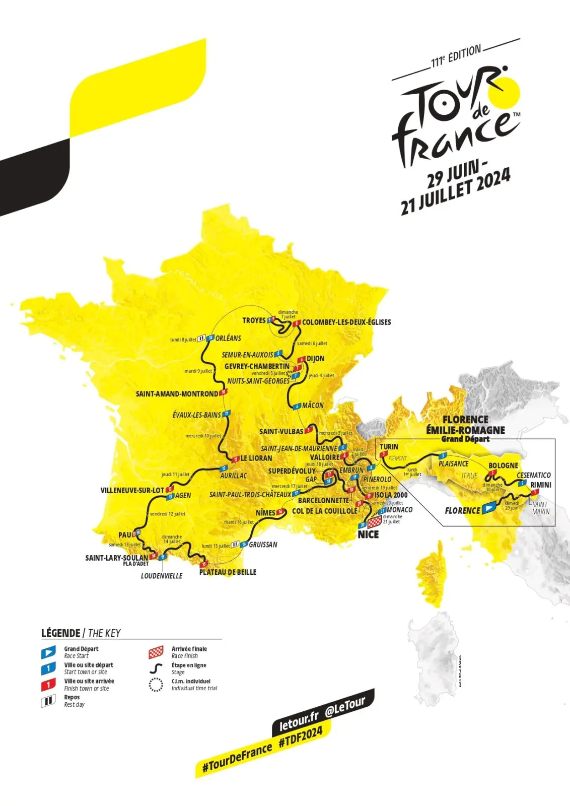 Le Tour de France 2024 se déroule du samedi 29 juin au dimanche 21 juillet, entre Florence en Italie et Nice. Il s’agit du premier Grand départ depuis la péninsule italienne (le 26e de l’histoire depuis l’étranger). C’est aussi un dénouement final en contre-la-montre qui n’est plus arrivé depuis 35 ans et le mythique duel Laurent Fignon Vs Greg LeMond en 1989, sur les Champs-Élysées. Au menu, le peloton (22 équipes composées de 8 coureurs, soit 176 coureurs) doit avaler un parcours de 3 492 kilomètres pour 53 230 mètres de dénivelé positif. À noter : un total de 59 km de contre-la-montre individuel, 14 secteurs de chemins blancs (soit 32 km) à traverser lors de la 9e étape autour de Troyes et le toit du Tour à franchir à 2 802 m d’altitude avec la Cime de la Bonette, la plus haute route asphaltée de France, le 19 juillet entre Embrun et Isola 2000. Après sa très lourde chute début avril au Tour du Pays basque, le Danois Jonas Vingegaard, double vainqueur en titre, est sur la ligne de départ et candidat à sa propre succession. Le Slovène Tadej Pogacar, vainqueur du Tour d’Italie en mai dernier, est lui aussi en course pour une troisième victoire au palmarès de la Grande Boucle et, surtout, un doublé Tour-Giro historique. Pour bien suivre la course, retrouvez les cartes, profils et cols des étapes ainsi que les horaires de diffusion TV de cette 111e édition du Tour de France.