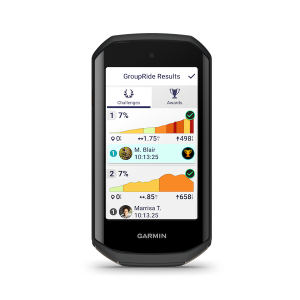 L’Edge 1050 présente des fonctionnalités conçues pour rassembler la communauté cycliste. La fonction GroupRide permet de rester connecté avec ses compagnons de sortie grâce à la messagerie intégrée, à la position de chacun en temps réel et aux alertes de détection d’incident. Ces alertes peuvent avertir les autres cyclistes et les guider vers la personne ayant besoin d’aide. Les groupes peuvent également donner une dimension compétitive à leurs sorties avec des classements en temps réel pour les montées par exemple.