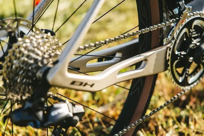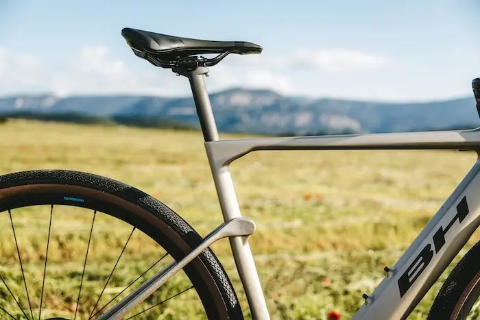 Le BH iGravelX est doté du Smooth Riding System (SRS) avec un point de pivot dans les haubans et un façonnage spécifique en carbone dans les haubans, offrant un débattement réel de la roue arrière de 3 à 5 mm. Cela filtre efficacement les vibrations tout en maintenant rigidité et performance. À l’avant, la fourche Air Bow Gravel amortit également les vibrations, assurant une tenue équilibrée sur les deux roues. Ces composants s’intègrent harmonieusement dans les lignes du cadre, conservant une esthétique fluide et élégante.